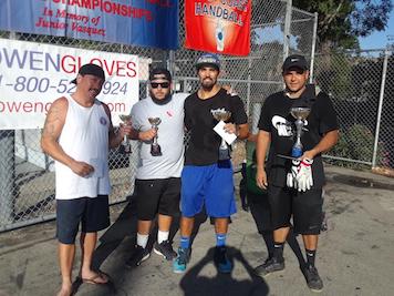 In the Mild division it was Marco Alatorre and Anthony Hernandez over Juan and Carlos Batiz. The Warm division was won by Boak Ferris and Bob Morones over Les Halberg and Curtis Irwin. Ferris and Morones qualified by winning a tiebreaker versus Pete Trejo and Parish Clarke. A red hot Roy Harvey and Chis Yokoyama defeated Mark Zamora Sr and Al Alvarez in the Hot divsion. The Caliente division featured Armando Ortiz Sr and Armando Ortiz Jr versus Dylan Hernandez and Daniel Badillo. Hernandez and Badillo reached the final with a tiebreaker win over Victor Perez and Sergio Guzman. Armondo Jr said the the only thing better than winning is winning with your dad and your dad scoring the final point.